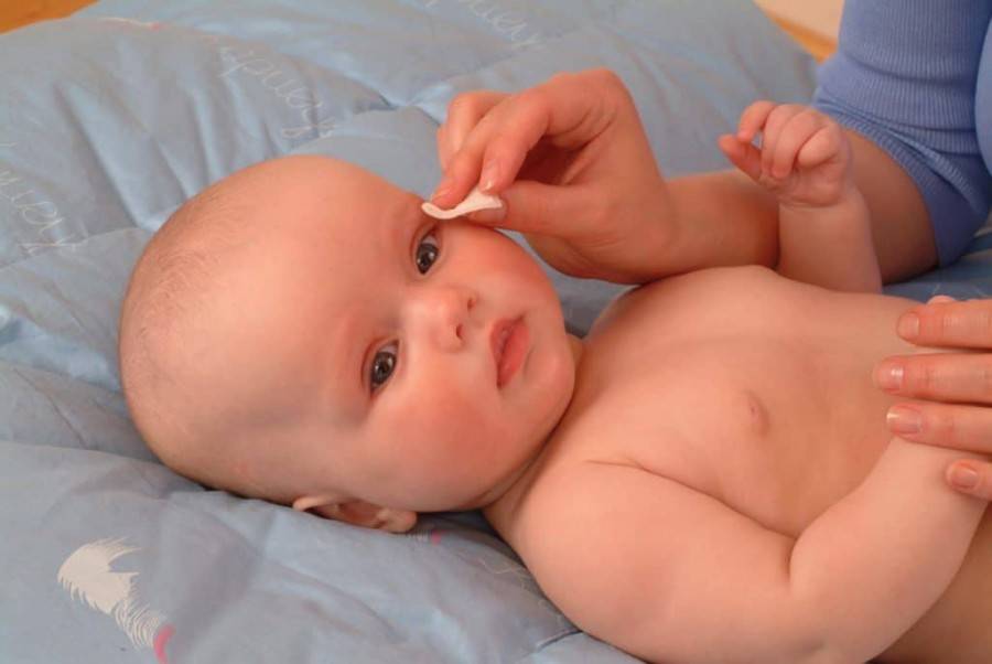 - Дважды в сутки малышу протираются глаза чистым тампоном, опущенным предварительно в кипяченую воду (один глаз — один тампон).