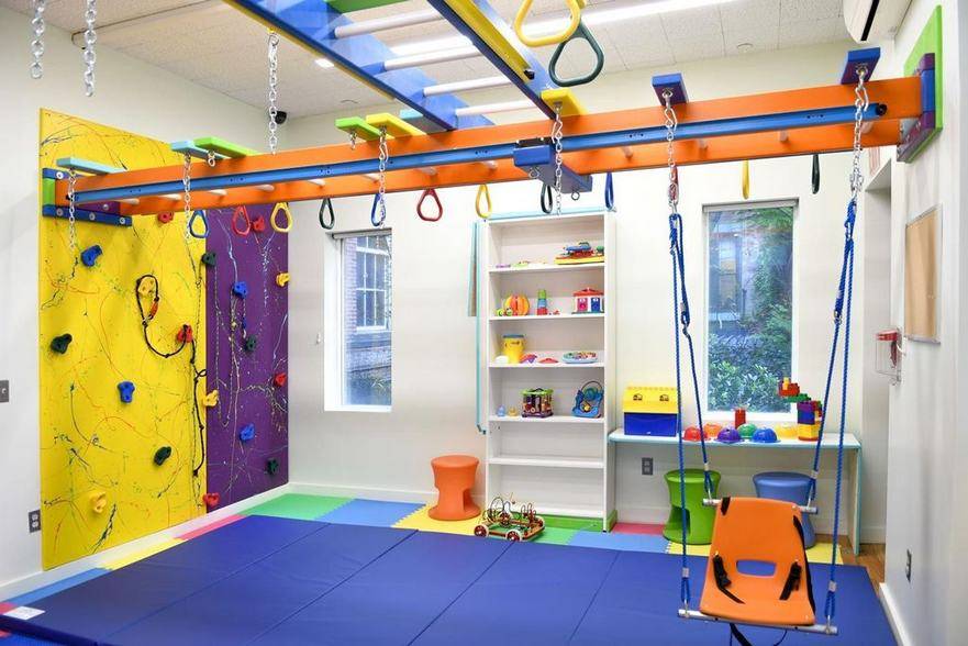 Для малогабаритной комнаты идеально подойдет уголок Г-образной формы, он более компактный. В его комплектацию обычно входит турник со шведской стенкой, кольца, различные навесные конструкции.