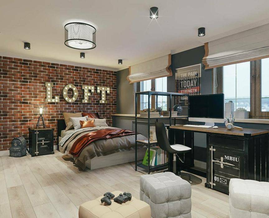 Одна из стен может быть акцентной – с кирпичной отделкой, либо украшена тематическим принтом.