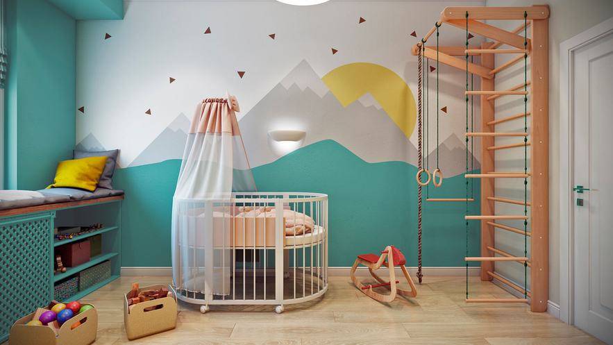 Для младенца интерьер комнаты не принципиален, ведь предпочтения еще не сформировались. Желательно выбирать нейтральную и нежную палитру оттенков, чтобы малыш и вы чувствовали себя в комнате спокойно. Цветовыми акцентами станут игрушки и стикеры-принты в игровой части и уголке для отдыха.