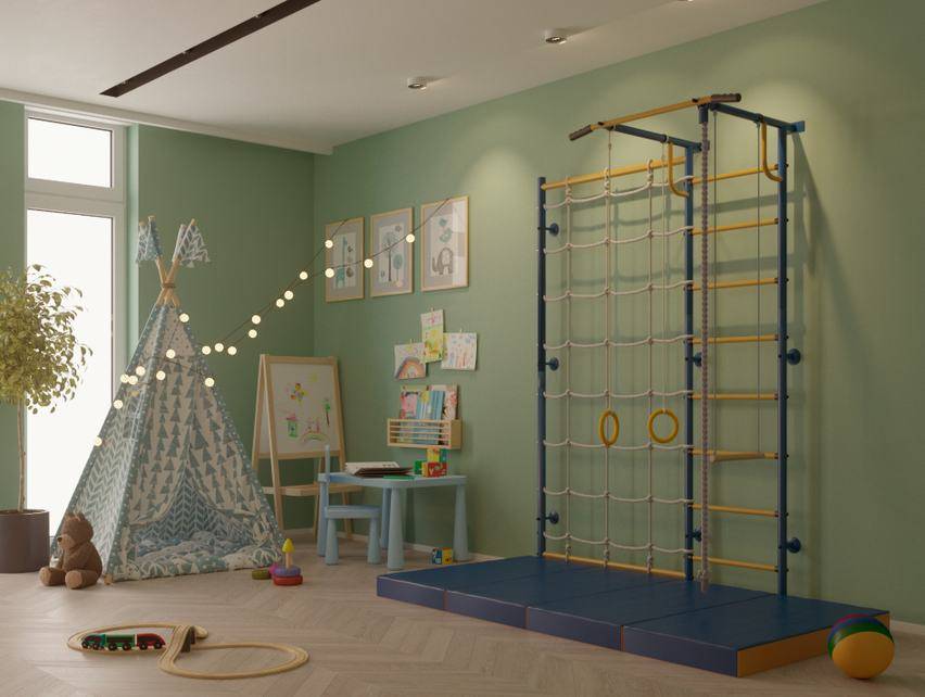 Если есть свободная площадь – сделайте спортивный уголок для тренировок (турник с кольцами, канат или полноценную шведскую стенку). Таким образом ваш ребенок сможет развиваться физически, не выходя из дома.