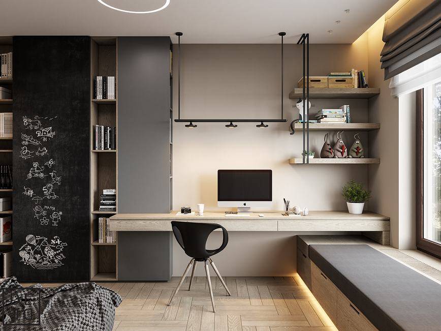 Используйте для этого оригинальные стеллажи из металла или дерева, многофункциональные светильники. В зоне отдыха освещение рекомендуется сделать приглушенным. В зоне для учебы более ярким.
