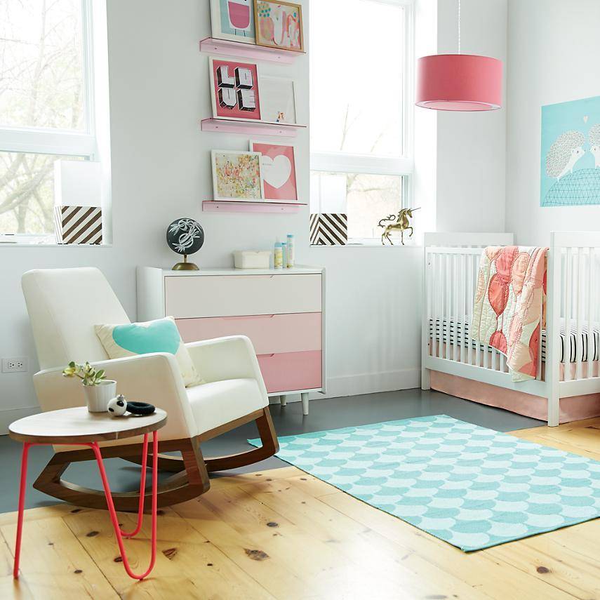 С точки зрения декорирования комнаты для малыша ковровыми покрытиями, важно не усердствовать. Первое время, пока ребенок не научится сидеть, а затем и ползать, небольшой коврик вам понадобится только в зоне детской кроватки или пеленального столика, там, где родители будут больше всего проводить времени