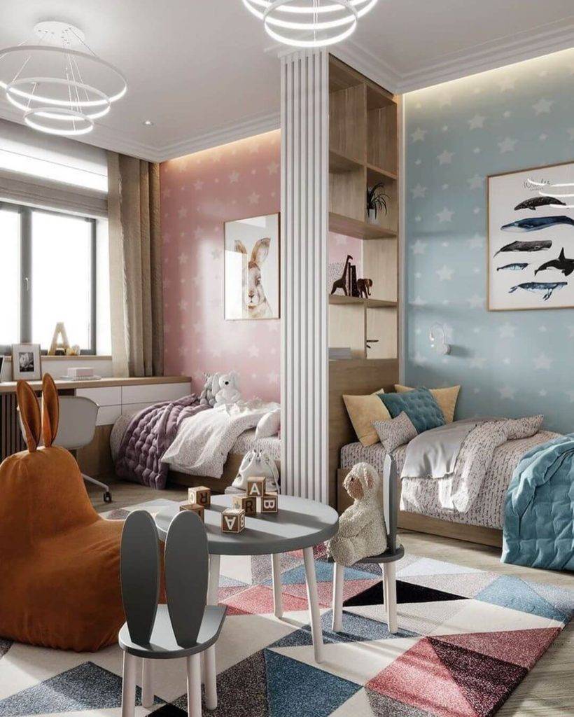 Начните с базовых моментов- в этой роли будут работать приглушенные цвета, которые будут соответствовать аксессуарам для мальчиков и девочек. Если вы не намерены разделять пространство с помощью двух цветов, установите белые или серые стены — с ними вы можете легко составить мебель, даже если по обе стороны от комнаты вы будете использовать мебель другого оттенка. Сделайте светлым пол, который не будет перегружать интерьер. Подойдет дубовый паркет, который будет хорошо смотреться как с деревянной мебелью, так и с оборудованием из досок, покрытых белым цветом.