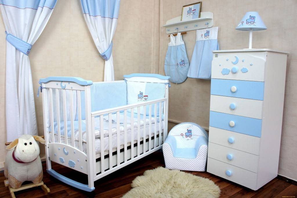 Во-первых, родители должны приобрести удобную кроватку для малыша. Большинство времени ребенок спит, поэтому кроватку выбирайте без занавесок и заслонок. В противном случае малышу не будет хватать свежего воздуха. На стенках кроватки должна отсутствовать оббивка, чтобы у мальчика или девочки была возможность видеть обстановку комнаты. Размещать кроватку рекомендуется в средине комнаты. Так вам удастся уберечь новорожденного от негативного влияния радиаторов. Не стоит ставить кроватку малыша возле окна, поскольку существует высокая вероятность того, что ребенок попадет на сквозняк.