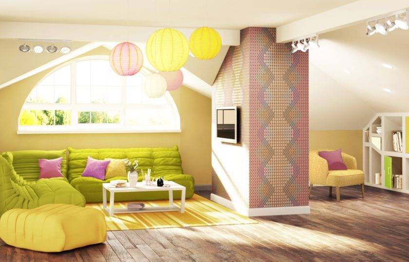 Цветовое решение зависит, прежде всего, от вкусовых предпочтений, характера ребенка, а также от освещенности мансарды. Если малыш активный, следует избегать насыщенных тонов. Пастельные, спокойные оттенки воздействуют на психику успокаивающе. Для уравновешенного, флегматичного ребенка более уместны сочные цвета.
