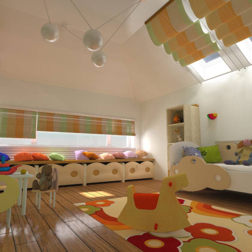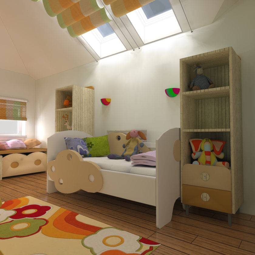 Всю мебель нужно расставить таким образом, чтобы она не загораживала свет, проникающий из окна. Детская, расположенная на мансарде, должна быть светлой.