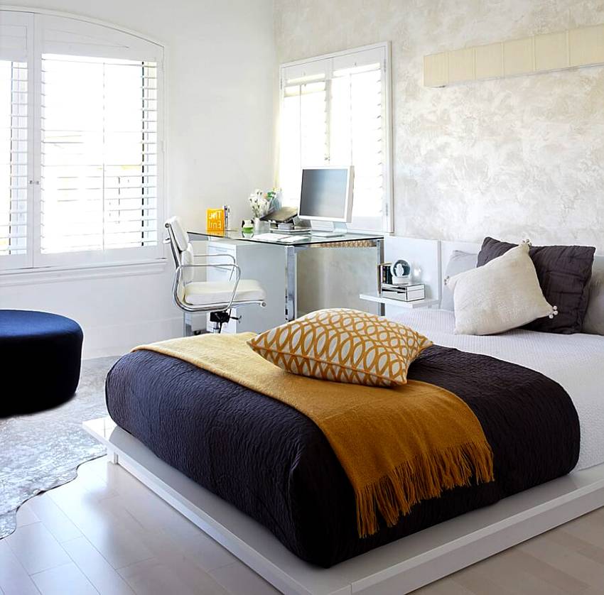Если возникает необходимость совмещать спальню и гостиную, то для кабинета отдельную комнату выделить не получится. Рабочий стол обычно размещают в спальне. Делать три зоны в помещении 20 м² не стоит (а в меньшем тем более). Значит, нужно обойтись минимумом мебельных элементов.