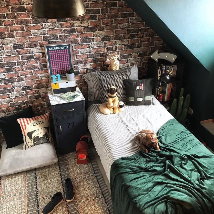 Комната для мальчика подростка, оформляется без изысков и может передавать аутентичную атмосферу гаража. Стены оклеивают недорогими обоями с имитацией кирпича или камня или отделывают резными панелями, потемневшими от времени, а потолок декорируют балками.