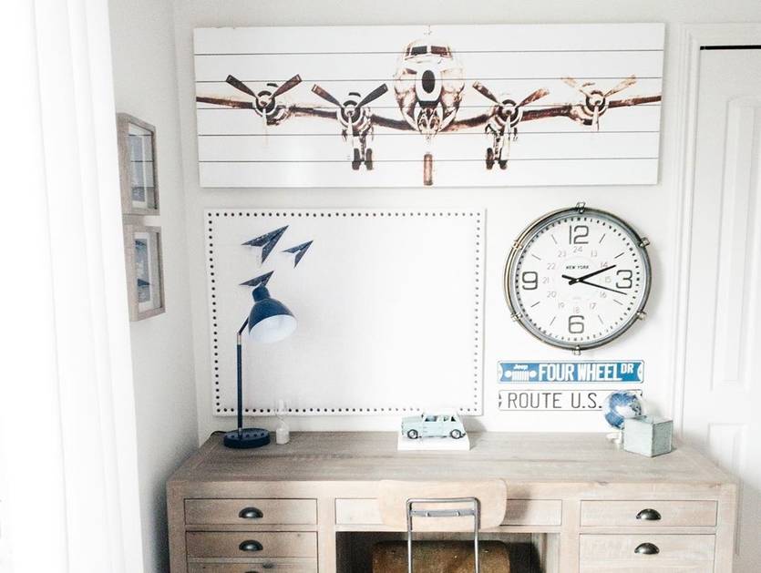 Достаточно часто в интерьере встречается декор в виде различных флагов, например, британского или бразильского. Для любителей техники можно использовать корабельные и самолетные модели. А для мальчиков, интересующихся наукой, подойдет большой аквариум, различные коллажи из фотографий, картины, астрономические карт или карты мира.