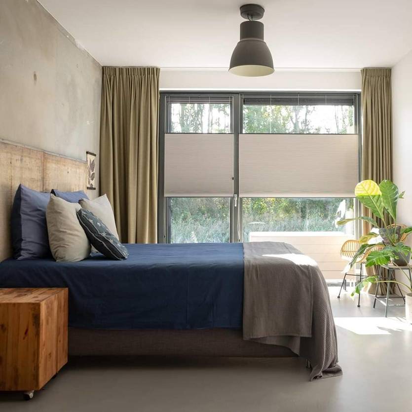 Книги и различный декор расставляют на открытых полках или стеллажах. Особого внимания заслуживает кровать, она должна быть выполнена из экологически чистого материала, например древесины. Идеально впишется в стилистику спальное ложе из металлических труб.