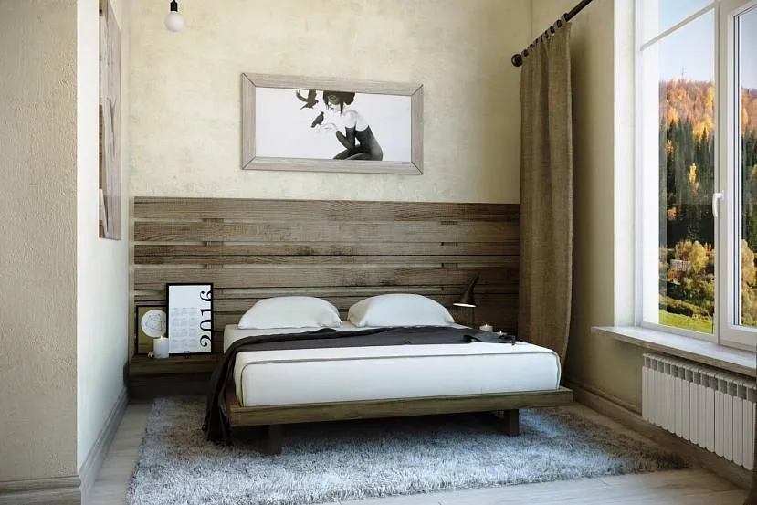 Кровать с деревянным изголовьемИсточник mydizajn.ru