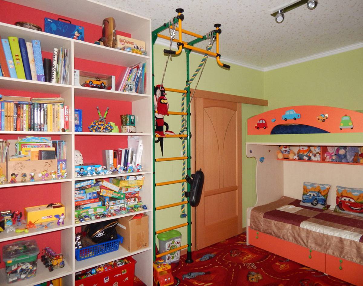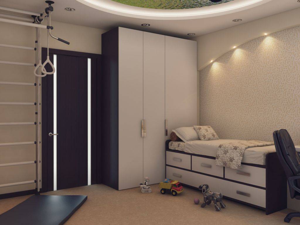 - Спортивный уголок. Он может включать в себя шведскую стенку, кольца, турник и мат. Ниже можно увидеть фото дизайна детской комнаты 12 кв. м со спортивным уголком.