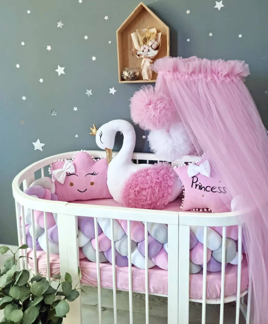 Светильники лучше выбирать простых форм. В комнате маленькой принцессы найдется место для красивых, вместительных коробочек-чемоданов, текстильных игрушек и подушечек-думок.