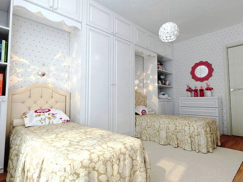 При помощи оригинального декорирования места отдыха удается полностью видоизменить окружающий интерьер. Например, стену над кроватями можно оформить декоративными буквами или другими персональными аксессуарами. Места для сна также застилают разными по цвету покрывалами, размещают возле кроватей непохожие друг на друга коврики или нарядно украшают изголовье девчачьего спального ложа.
