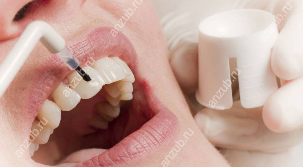 - Финальный этап подготовки – это сушка зубов. Их буквально высушивают, окончательно подготавливая таким образом эмаль к нанесению специального средства.