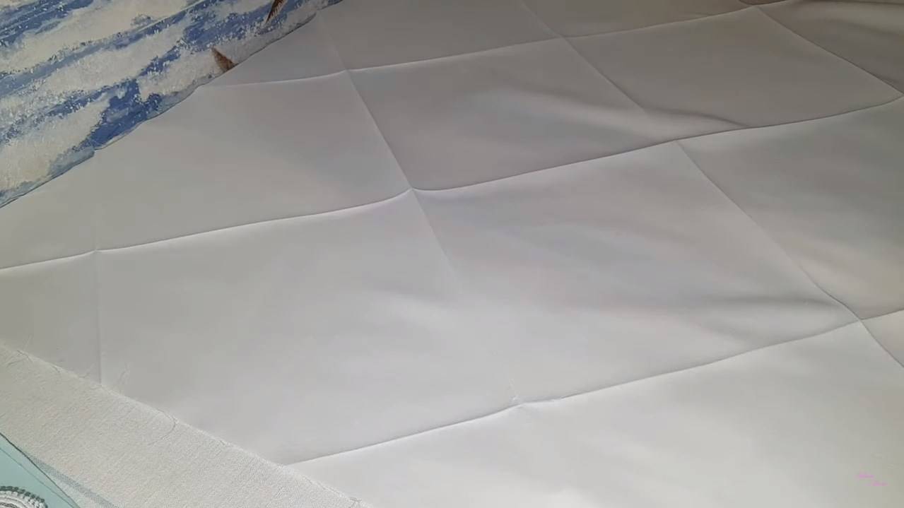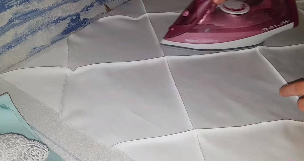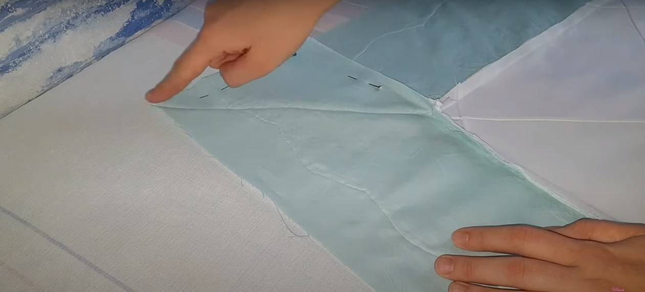 - Когда все боковые полоски ткани пришиты, находим диагональ между ними, проглаживаем эту линию утюгом и прошиваем ее на машинке.
