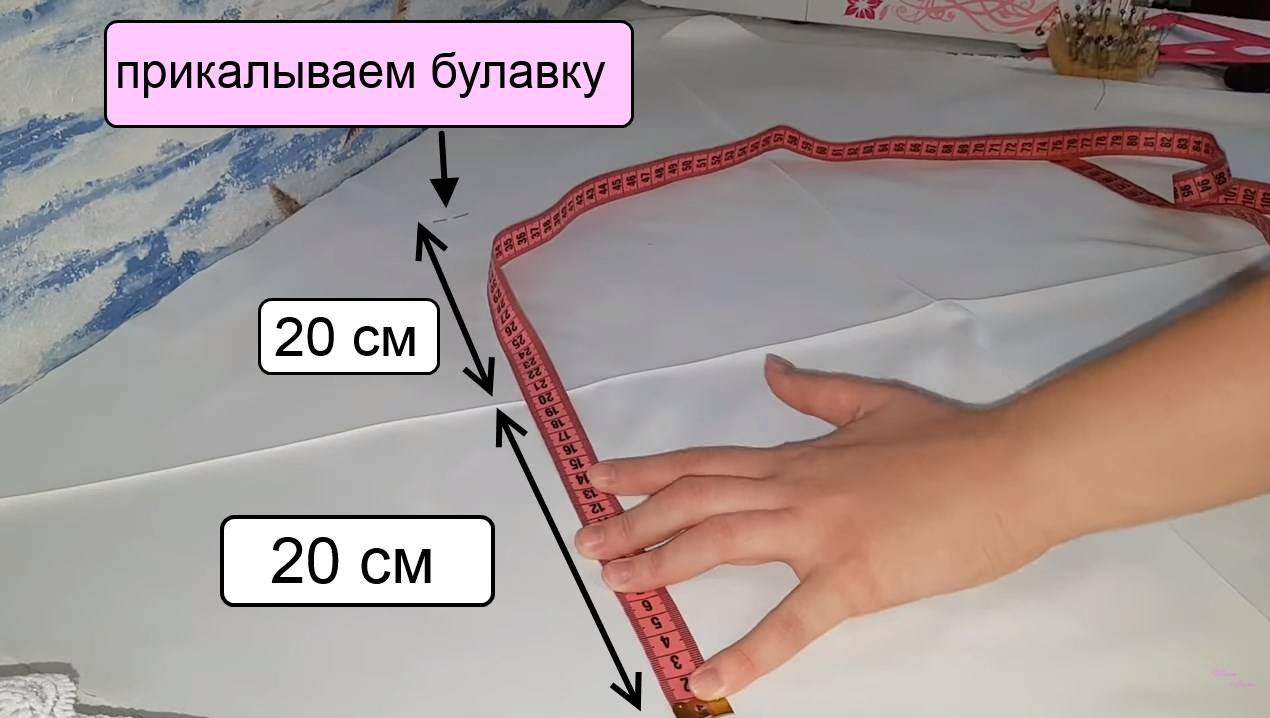 - После этого отступите от проглаженной линии под прямым углом 20 сантиметров в сторону. Наметьте это место булавкой. Отступите от этой же линии 20 сантиметров и в другую сторону и тоже обозначьте это место.