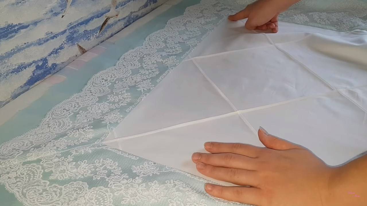 - Поверните ткань лицевой стороной вверх, а потом сложите ее по диагонали вдвое и прогладьте утюгом эту диагональ. Таким же образом обозначьте и вторую диагональ этого квадрата. Должны получиться две проглаженные диагонали, которые четко видны.
