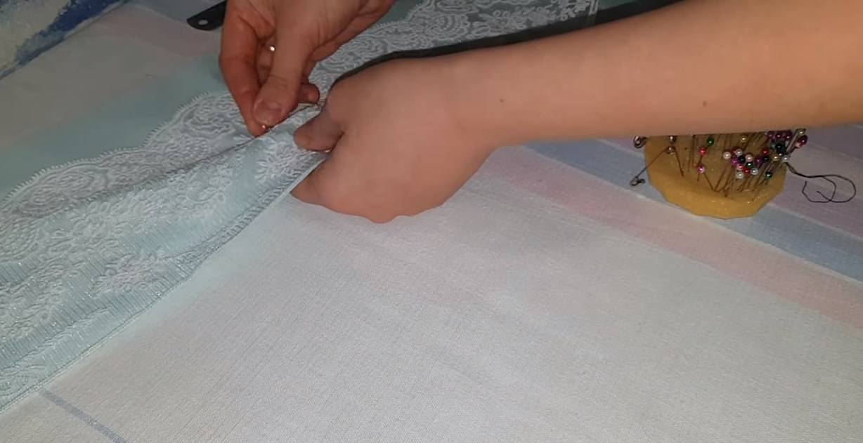 Скалываем булавками кружево и детали будущей рамки пододеяльника