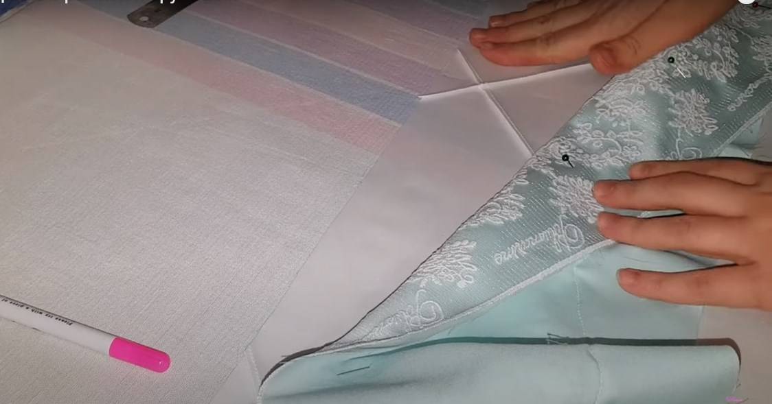 Из ткани вырезаем прямоугольник длинной чуть больше 2 м и шириной 1 м с лишним, оставляя, таким образом, возможность сделать припуски. Далее складываем этот кусок пополам и сшиваем с изнаночной стороны при помощи швейной машинки, оставляя небольшой отрезок незашитым. Уголок, предназначенный для украшения кружевами, делаем закругленным. Лучше чтобы он находился с противоположной стороны от незашитого отрезка.
