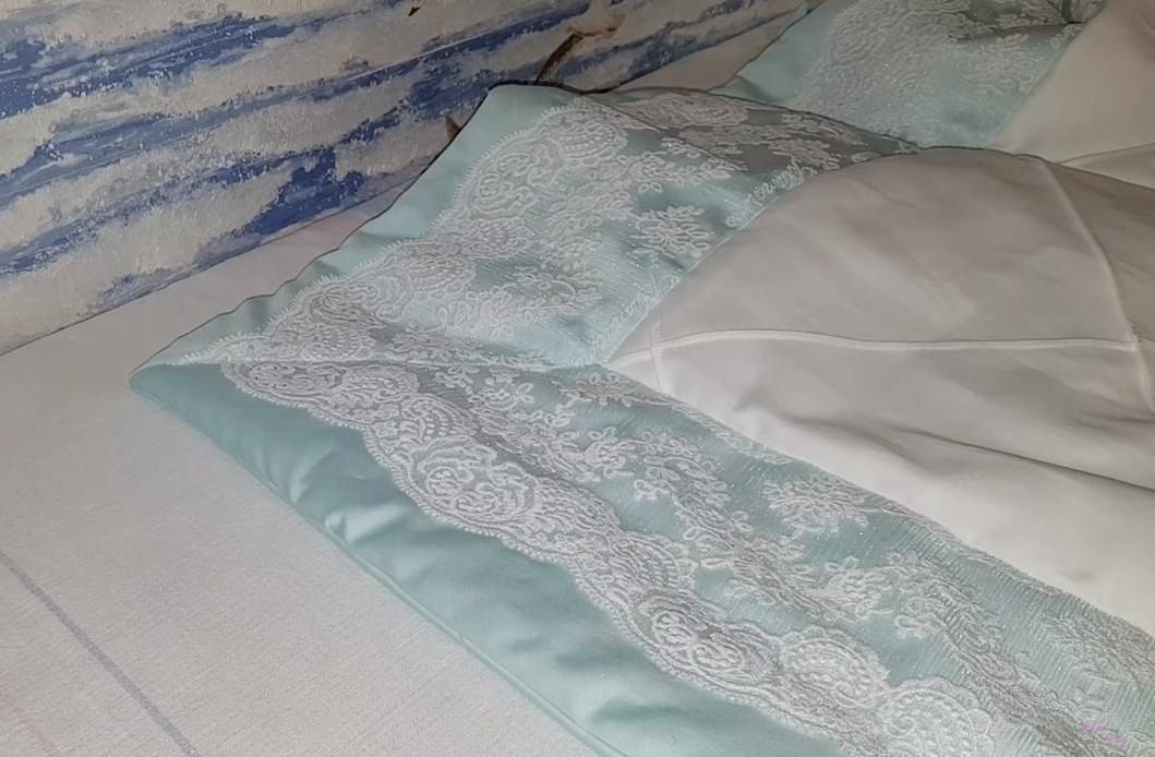 - Сложите лицевой стороной друг к другу середину пододеяльника для новорожденного на выписку и рамку с уже пришитым кружевом. Сшейте эти детали вместе.