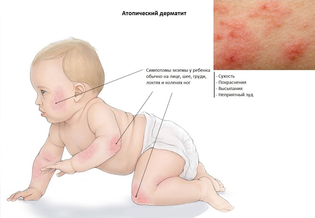 Изначально высыпания возникают на личике, впоследствии «расползаясь» на ручки и ножки. Аллергическим фактором могут послужить пищевые продукты, бытовая химия и пр.