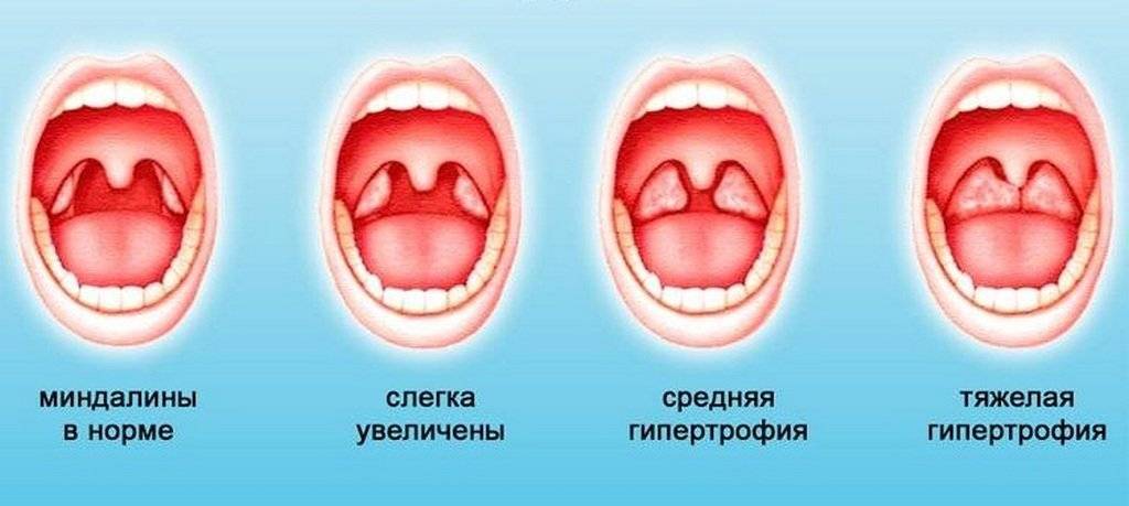 Различают разные стадии увеличения миндалин. Всего их четыре: