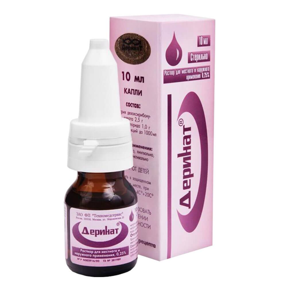 Деринат применяется при комплексной терапии и монотерапии (от насморка, бронхита, ларингита и так далее). Проявляет противовирусные, противовоспалительные, обезболивающие, заживляющие и противоаллергические свойства. Составные части препарата натрий дезоксирибонуклеат и хлорид натрия действуя совместно, помогают организму побороть недуг. Первое из них заживляет, укрепляет иммунитет, а второе очищает слизистые оболочки.