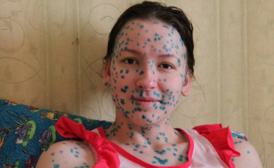 После ветрянки на кожных покровах головы и тела остаются непривлекательные пятна зелёнки. Их можно удалить одним из нижеприведенных способов: