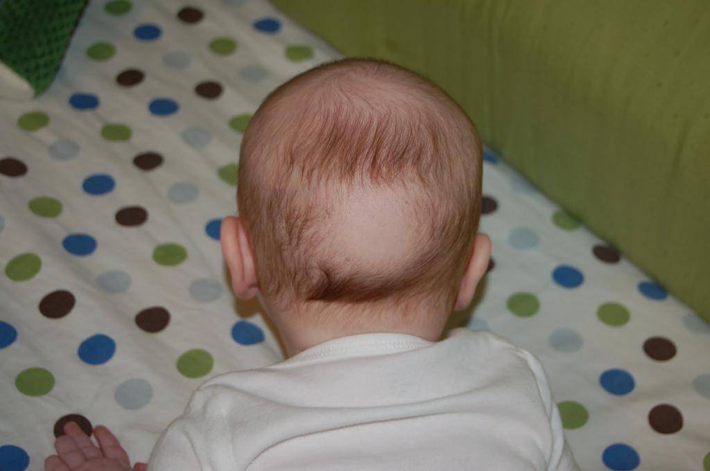 Образование подобных лысин сильно беспокоит родителей абсолютно напрасно, потому что причина их – лежащий на спине образ жизни. Ребенок, вертя головой по сторонам, протирает на затылке волосы. Как только малыш научится переворачиваться на живот, садиться и ползать, волосяной покров станет равномерным, а лысинка исчезнет