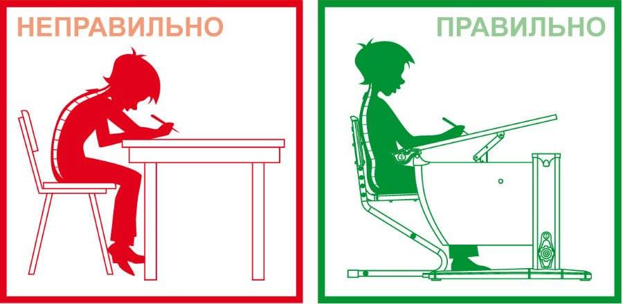 Тщательно контролируйте, чтобы ребенок не закидывал ногу на ногу, не ложился на стол грудью, не подгибал ноги, не сидел боком к столу. Мебель должна подбираться индивидуально под ребенка, в соответствии с его ростом.