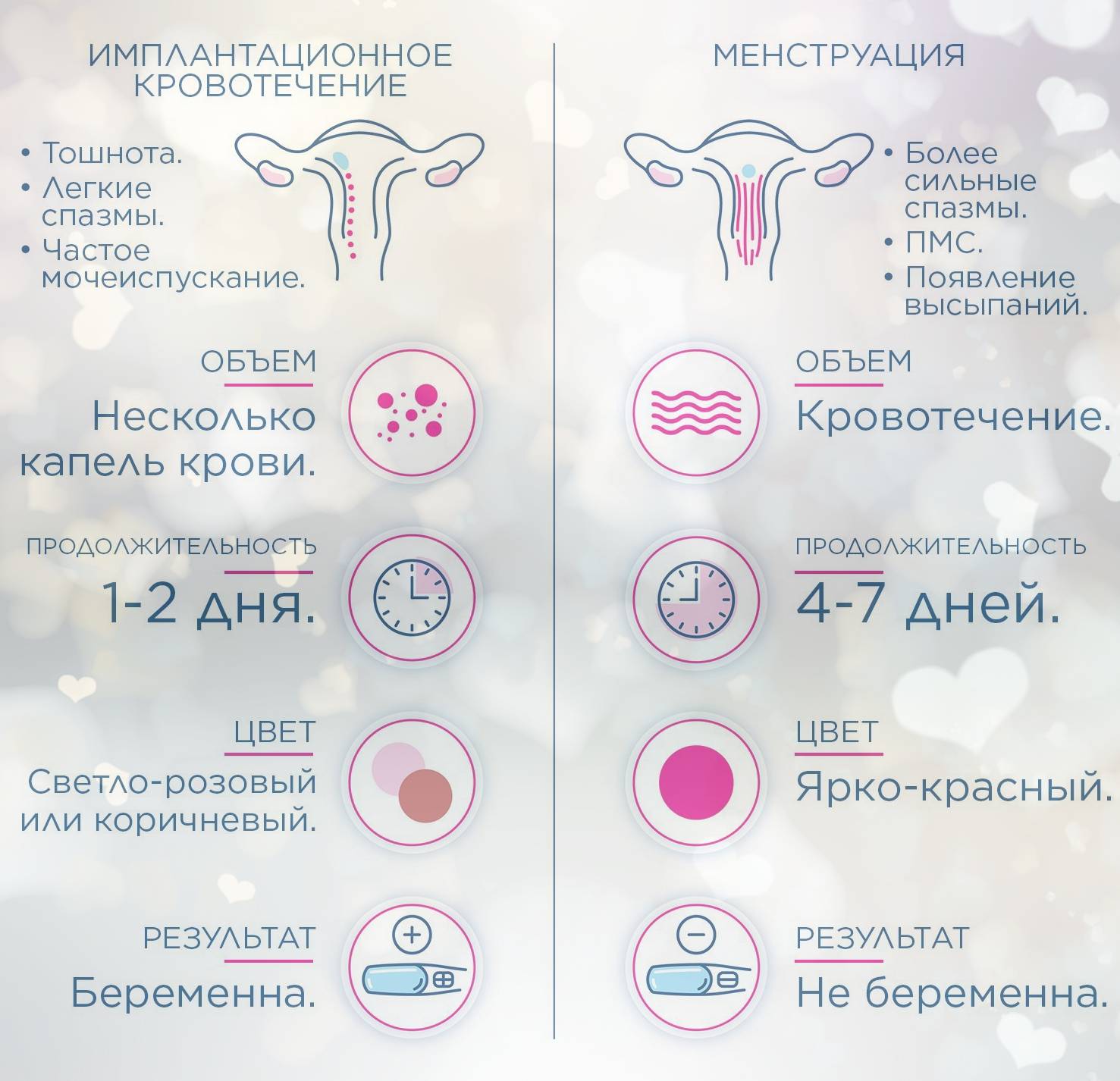 - Небольшие выделения в дни предполагаемых месячных могут указывать на беременность. Они могут продолжаться 1–2 дня. Гормональный фон на ранних сроках беременности еще не изменился, поэтому могут наблюдаться скудные и непродолжительные менструальные выделения. Может быть имплантационное кровотечение. Его инициирует процесс внедрения эмбриона в стенку матки.