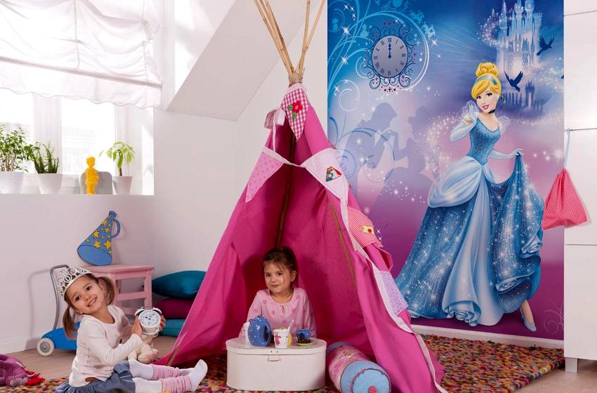 Девичья комната, независимо от возраста, может быть украшена фотообоями с принцессами, феями, куклами Барби
