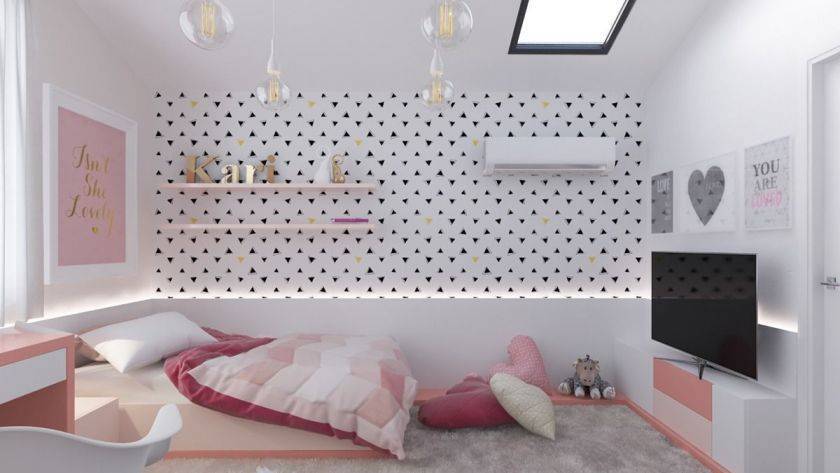 В крохотном помещении, предназначенном для проживания, учебы и отдыха молодой леди, нужно максимально использовать свободное пространство стенок.