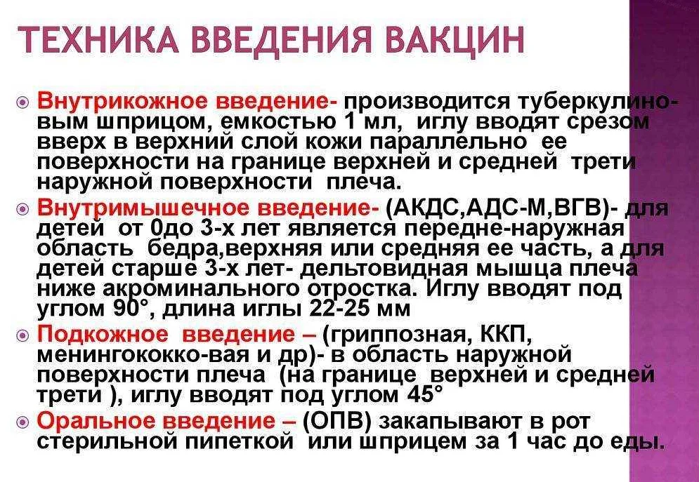 Куда ставят прививку, также зависит от возраста прививаемого ребенка. Малышам до 1,5 лет прививка делается внутримышечно в верхнюю треть бедра, более взрослым детям – в плечо (дельтовидную мышцу). Если ребенок страдает заболеванием крови, препарат вводится подкожно.