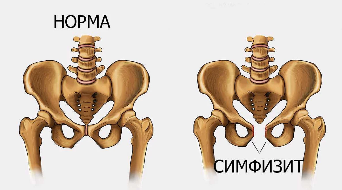 Некоторые заболевания проявляются такими же симптомами, как и симфизит: • Инфекционные болезни. Остиомиелит – это гнойная инфекция, которая поражает суставы при снижении иммунитета. Возбудитель недуга – золотистый стафилококк. Когда стафилококк размещается в лонном сочленении, появляется отёк, болезненность в области лобка, повышается температура. Схожие симптомы могут провоцировать туберкулёз и сифилис. • Ишиас – это воспалительное поражение седалищного нерва. У будущей мамы, начиная с 13 недели беременности, повышается риск защемления нерва увеличенной маткой или плодом во время переворота. Воспалённый нерв провоцирует болевой синдром, которую легко спутать с симфизитом. Однако боль при ишиасе локализуется в задней части бедра и отдаёт в ногу, отёчность и боль в области лобка отсутствует. Ишиас может возникнуть и после рождения ребёнка при восстановлении первоначального положения костями таза. • Тромбоз вен малого таза. Нередко данное заболевание возникает через 15 – 20 дней после рождения ребёнка. Женщина испытывает тупую боль в области таза, ноги отекают, возникает боль при ходьбе. • Паховая или бедренная грыжа. Достаточно редко у женщин диагностируют грыжу, которая образуется в районе лобкового сочленения. Эта патология провоцирует болезненные ощущения и дискомфорт. После появления на свет малыша паховая грыжа самостоятельно исчезает. • Свободная жидкость в малом тазу после родов. Этот симптом часто указывает на гинекологические патологии, внутрибрюшное кровоизлияние или онкологические образования в половых органах. Отличия от симфизита – обильные выделения, менструальные нарушения, повышение температуры. При появлении вышеописанных симптомов следует обратиться к доктору, который установит диагноз и назначит грамотное лечение.