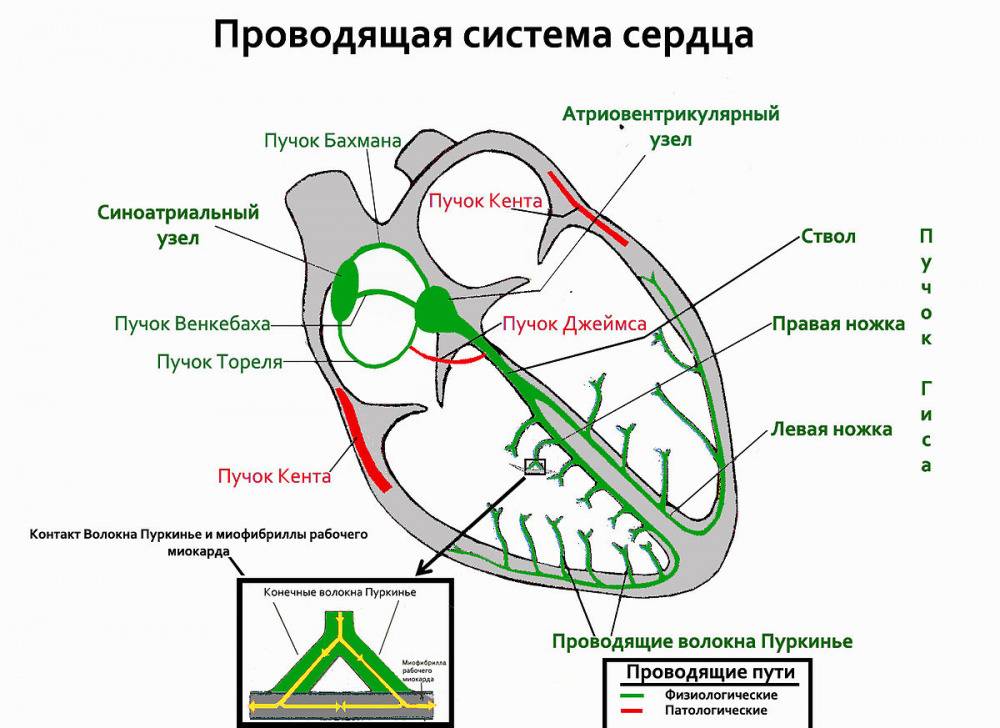 Сокращение мышц сердца обеспечивает проводящая система. В ее составе находятся синусовый и атриовентрикулярный узлы, пучок Гиса и волокна Пуркинье.