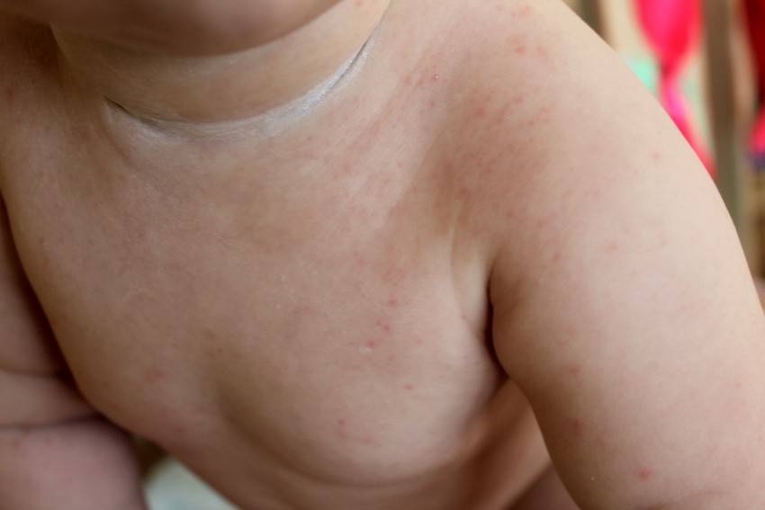 Проявляется в виде прыщичков красного цвета, внутри которых может быть прозрачна жидкость. Если жидкость стала желтой или мутной, значит, началось инфицирование, требуется прием у педиатра. На начальных этапах развития раздражения сыпь появляется только в складочках шеи, а затем, если ее не лечить, переходит на лицо.