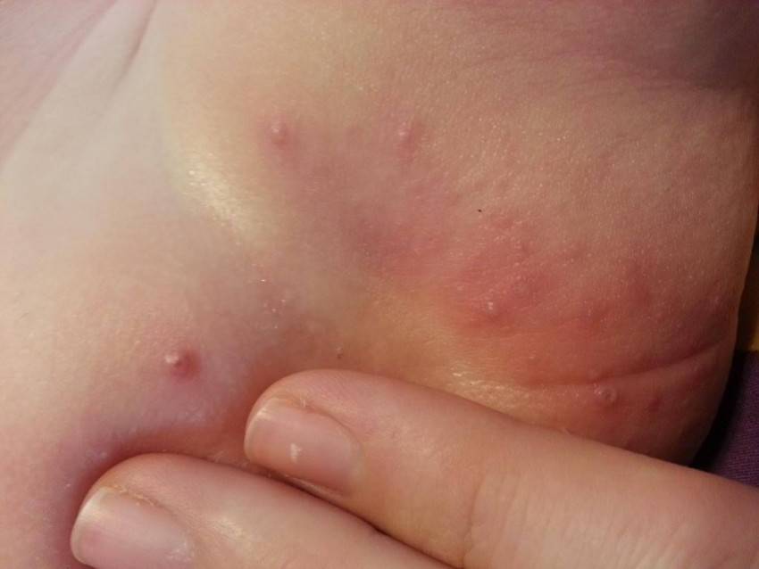 Проявляется в виде прыщичков красного цвета, внутри которых может быть прозрачна жидкость