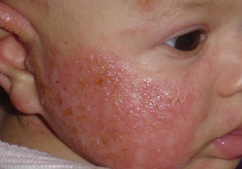 Небольшие прыщики с бесцветной жидкостью внутри. Может переходить на лицо в области висков и лба. На месте возникновения сыпи иногда наблюдается частичная потеря волос. Высыпания вызывает зуд, малыш может быть беспокойным.