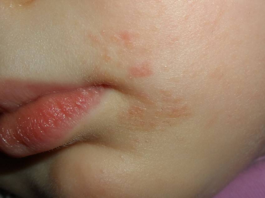 Красные точки, локализующиеся в области подбородка, щек, за ушками. Раздражение на лицо переходит от головы или шеи.