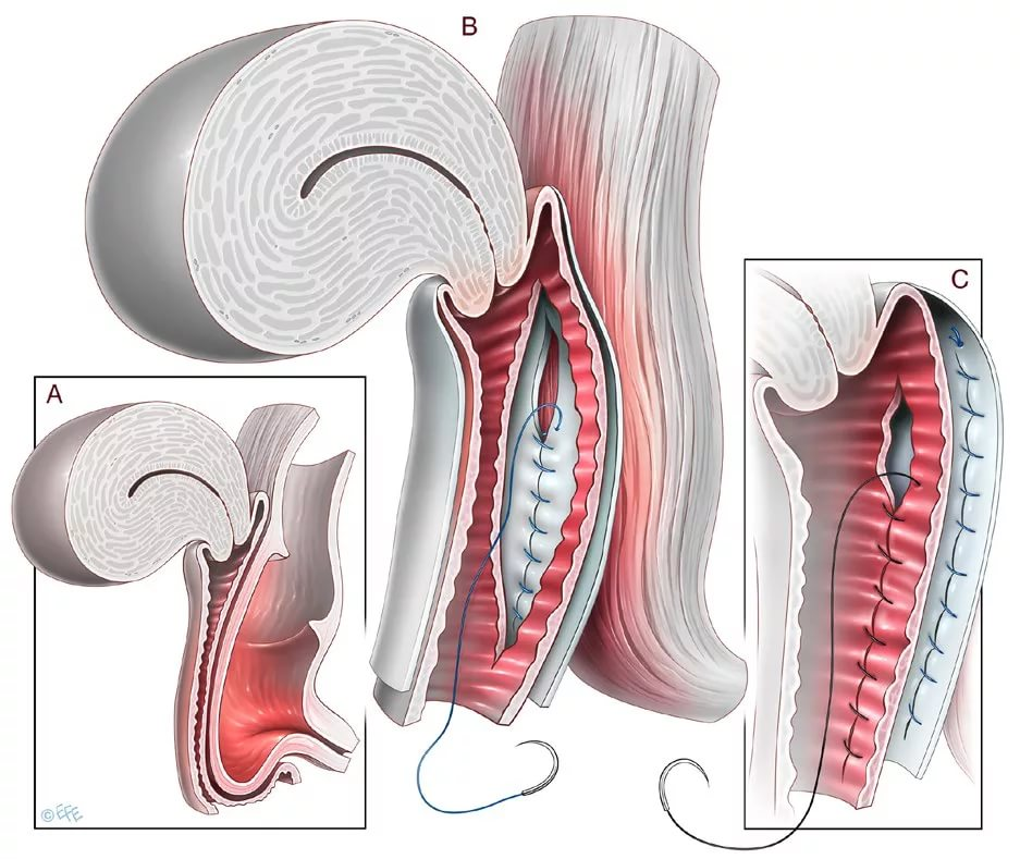 На первом этапе выбирается часть слизистой оболочки, подлежащая коррекции. Она продольно иссекается, после чего ткани послойно сшиваются. Влагалище становится уже. С помощью данного метода возможно удаление послеродовых рубцов.