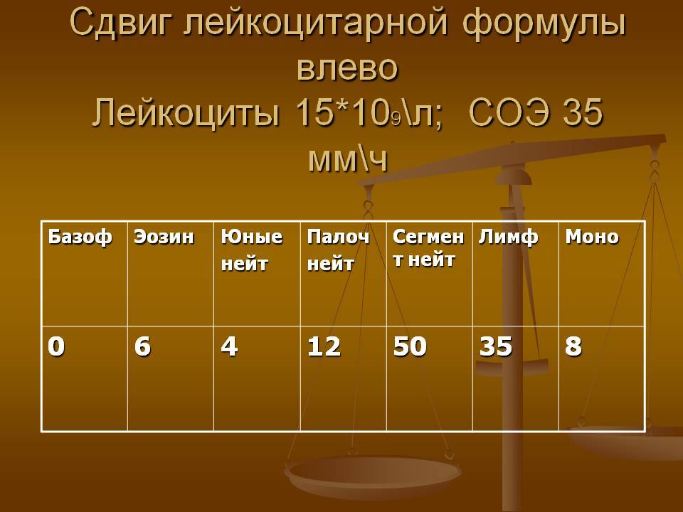 Под сдвигом влево подразумевается недостаточное содержание всех или части белых кровяных телец. Чаще всего это обозначает развитие инфекционного заболевания, в борьбе с возбудителями которого гибнет большое количество клеток-защитников.