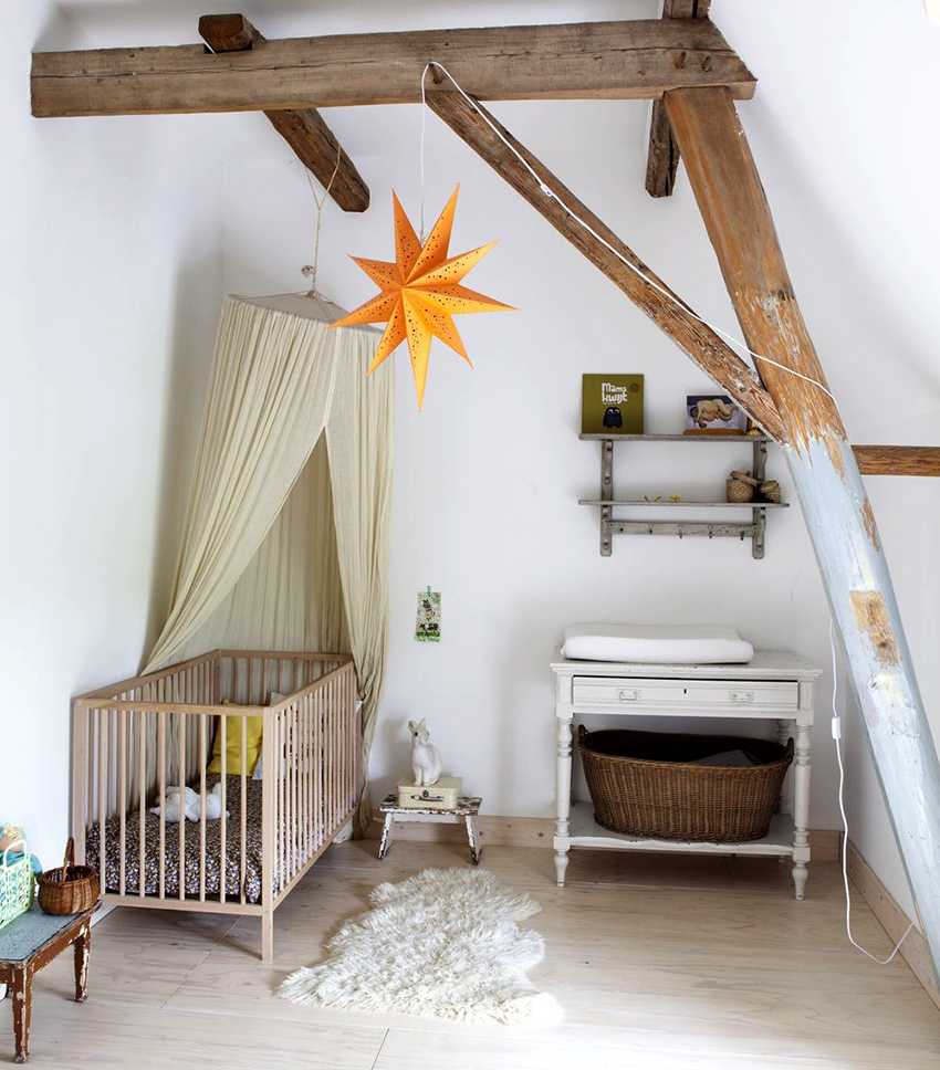 Чтобы развлечь младенца, над кроваткой внутри балдахина стоит подвесить музыкальную карусель с игрушками (мобиль), а с внешней стороны вуали не помешает светодиодная гирлянда в теплом белом спектре — рассеиваясь сквозь ткань, мерцающий точечный свет будет выглядеть очень уютным и мягким.