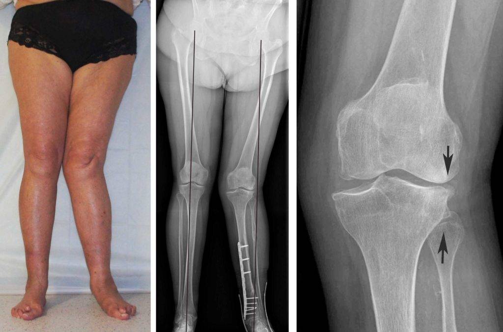 В ходе оперативного вмешательства врачи удаляют фрагменты большеберцовой и бедренной костей, после чего устанавливают аппарат Илизарова. Прооперированные участки фиксируют пластинами и винтами или ставят металлические рамы снаружи конечности (на фото). При нестабильности коленного сустава дополнительно проводят пластику связок.