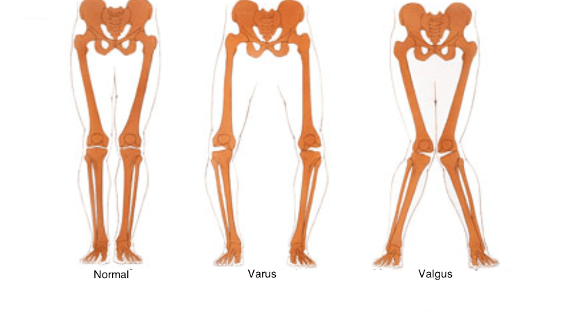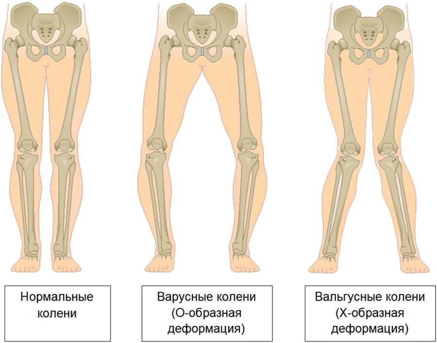 - По виду деформации: варусная (О-образная) или вальгусная (Х-образная). В большинстве случаев выявляется О-образное искривление ног, Х-образное встречается редко.