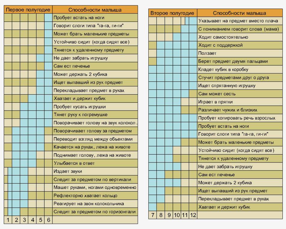 К завершению первого года жизни каждый ребенок должен уметь ползать, ходить, говорить осознанно слово «мама», указывать на предметы, играть в прятки. Чтобы специалистам было проще выявить степень развития ребенка, существуют специальные таблицы психомоторного развития ребенка до 1 года по месяцам.