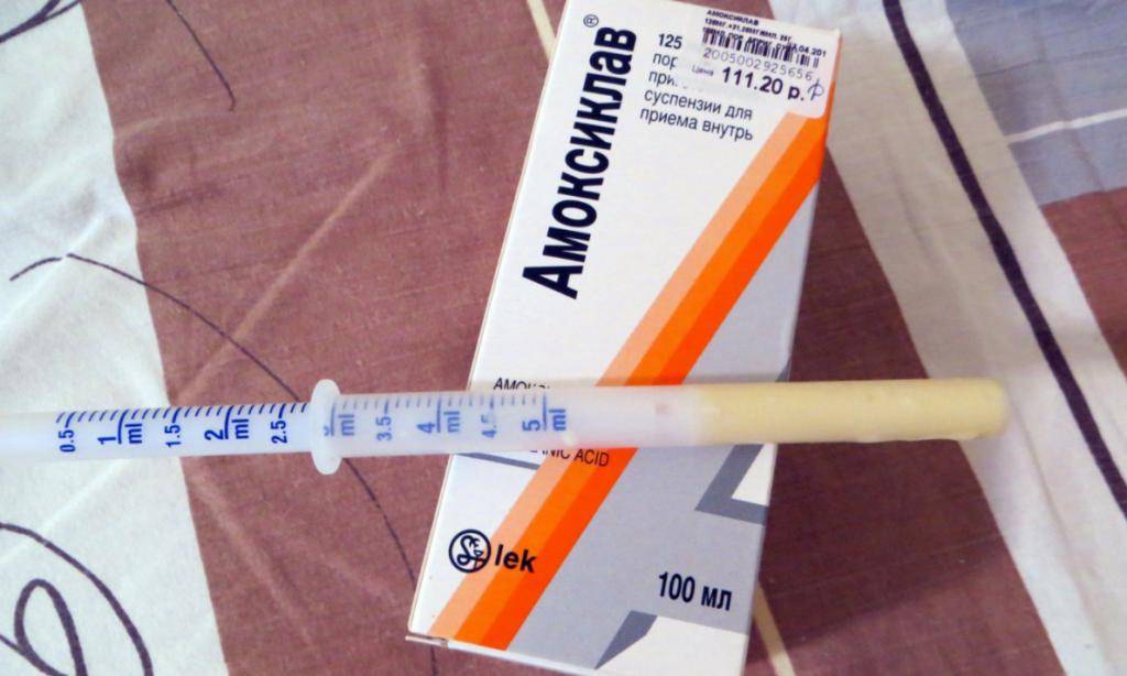 Порошок, который разводится водой, выпускают также в флаконе из темного стекла. Упаковка содержит один такой флакон и мерную ложку. В инструкции по применению к “Амоксиклаву” для детей написано, что в 5 мл готового средства могут содержаться амоксициллин/клавулановая кислота.