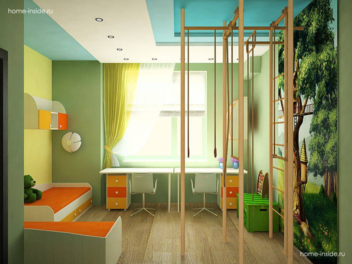 Если комната оформляется для двух мальчишек приблизительно одного возраста, здесь стоит продумать спортивный уголок со шведской стенкой или турником, место для игр, творческую зону. У каждого ребенка должен быть свой письменный стол для занятий и две кровати. Кровати можно сделать одинаковыми и разделенными прикроватными тумбочками. Либо же, можно остановить выбор на двухъярусной кровати, при условии, что комната не более 12 кв. м.
